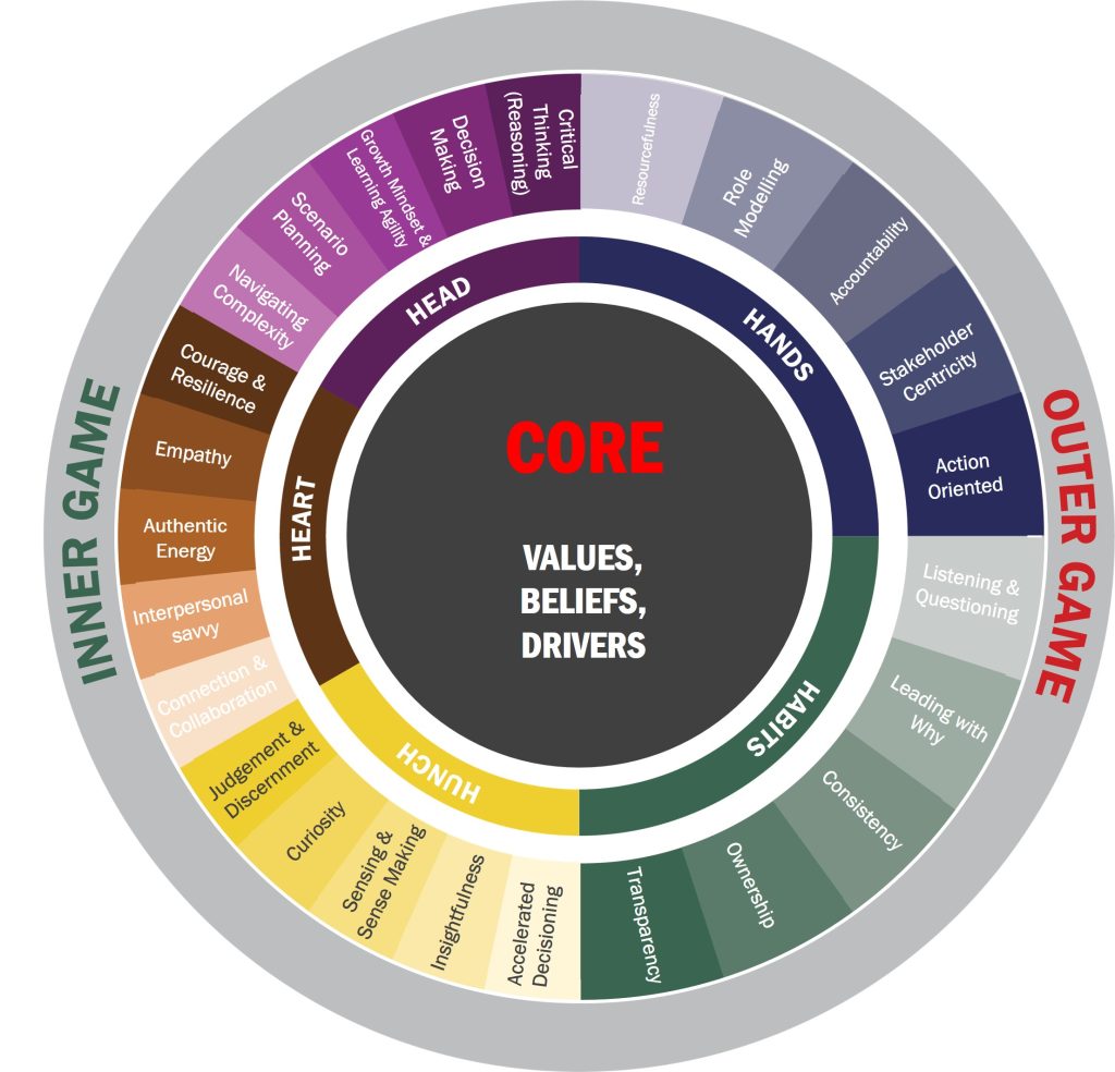 The Head, Heart, and Hunch live in the Inner Game – the internal processes drive us to lead with purpose. The Hands and Habits exist in the Outer Game – the ways we translate our intent into action.